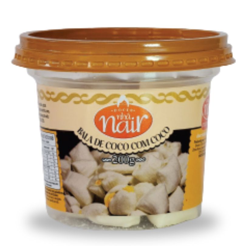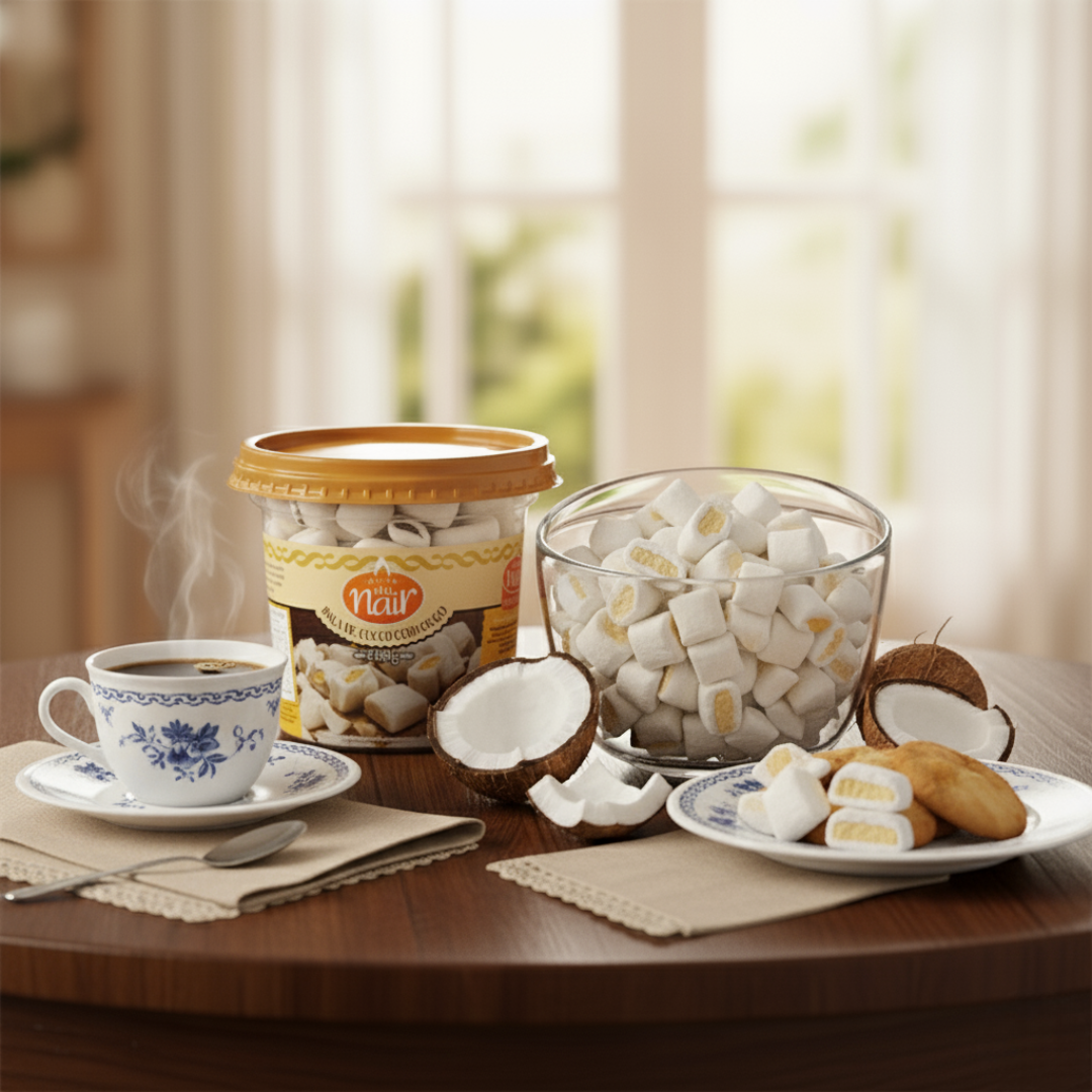 A Bala de Coco com Coco Nhá Nair é o equilíbrio perfeito entre maciez e crocância sutil, feita à moda antiga para quem aprecia o verdadeiro sabor caseiro.