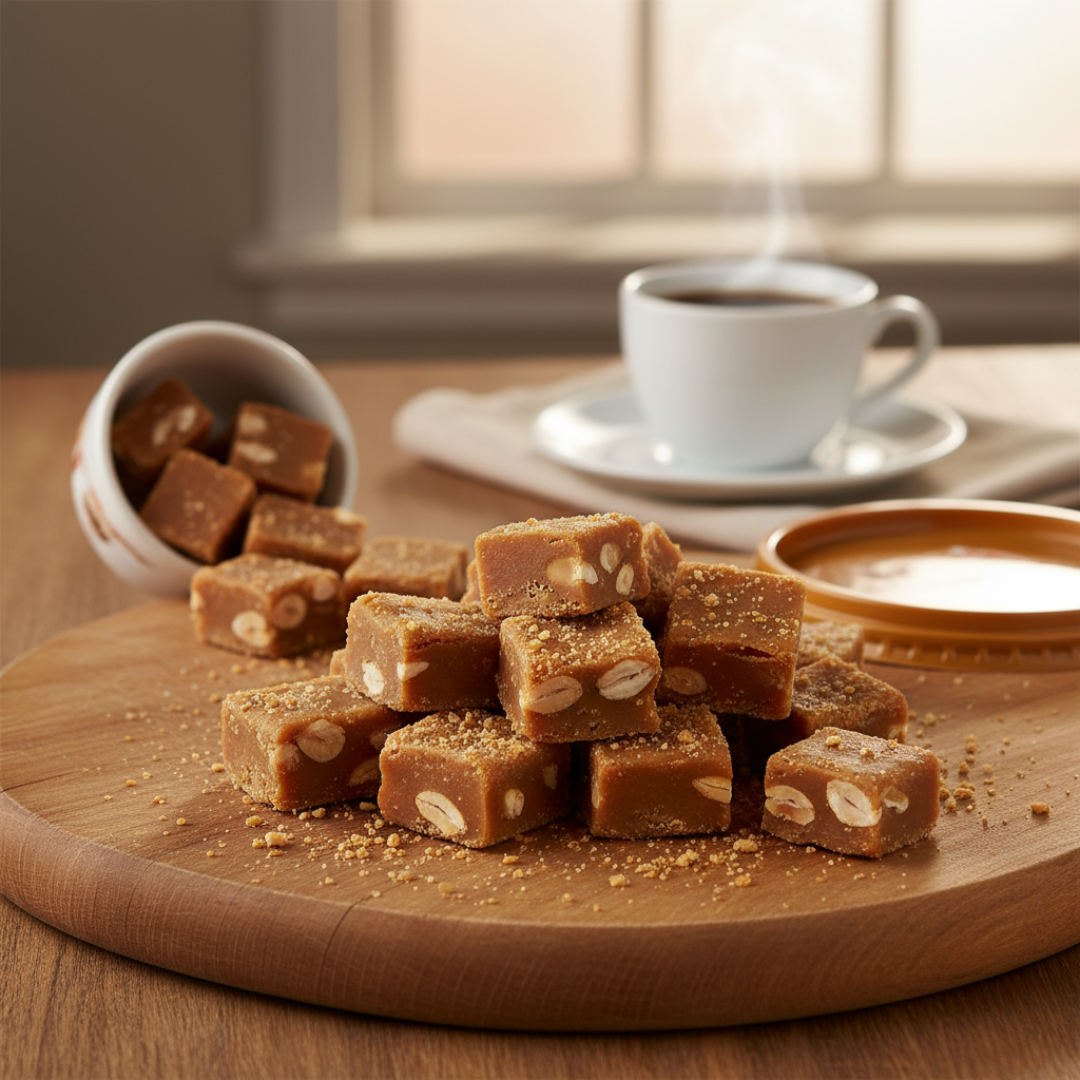 Doce de Leite com Amendoim! O toque crocante que surpreende a cada mordida! Nosso Doce de Leite com Amendoim vem cortado em pedacinhos na medida certa, apresentando aquela firmeza clássica de doce de corte. Mas a mágica acontece na boca: sua textura inigualável é macia e derrete lentamente, enquanto pedacinhos selecionados de amendoim torrado criam um equilíbrio delicioso entre a doçura e um leve salgadinho. É a combinação perfeita para desfrutar com o calor e o amargor de um cafezinho passado na hora. Um momento de puro conforto e sabor de fazenda que você precisa experimentar!